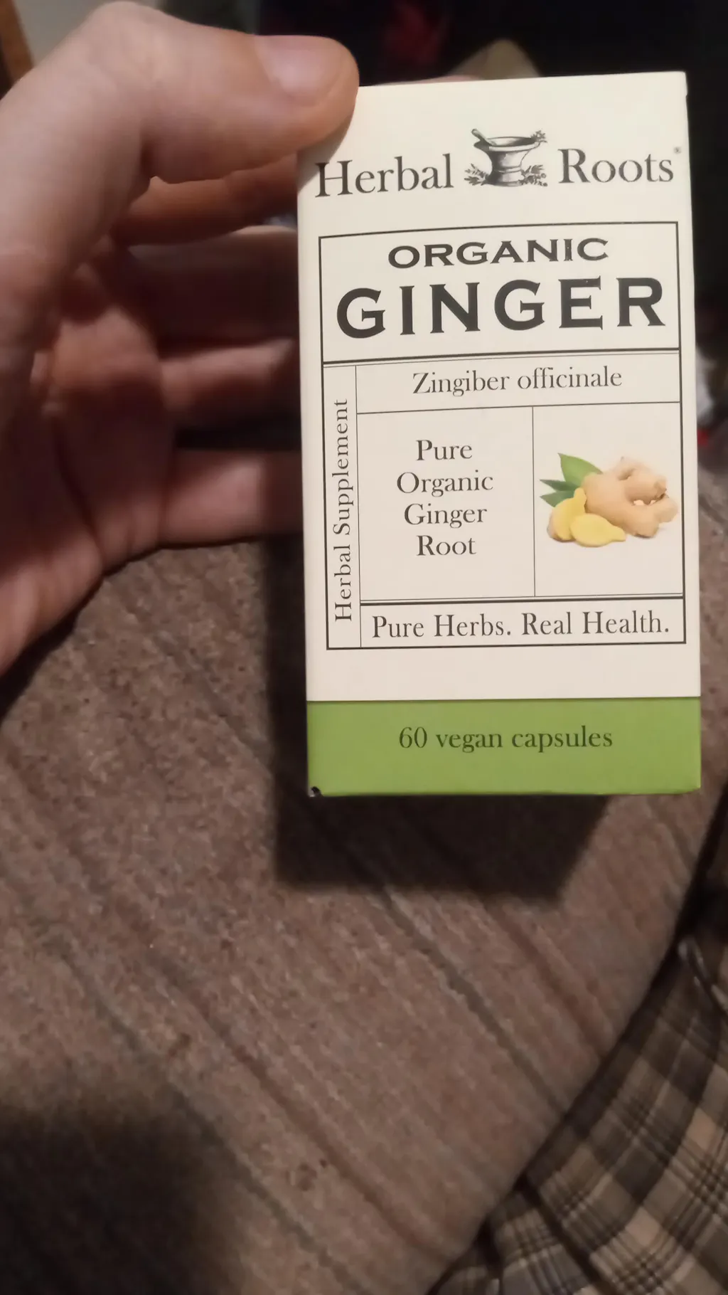Herbal Roots Ginger supplement contains 1,200 mg USDA-certified organic Ginger, vegan capsules and nothing else!